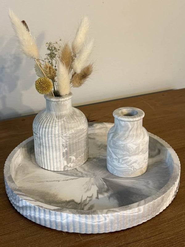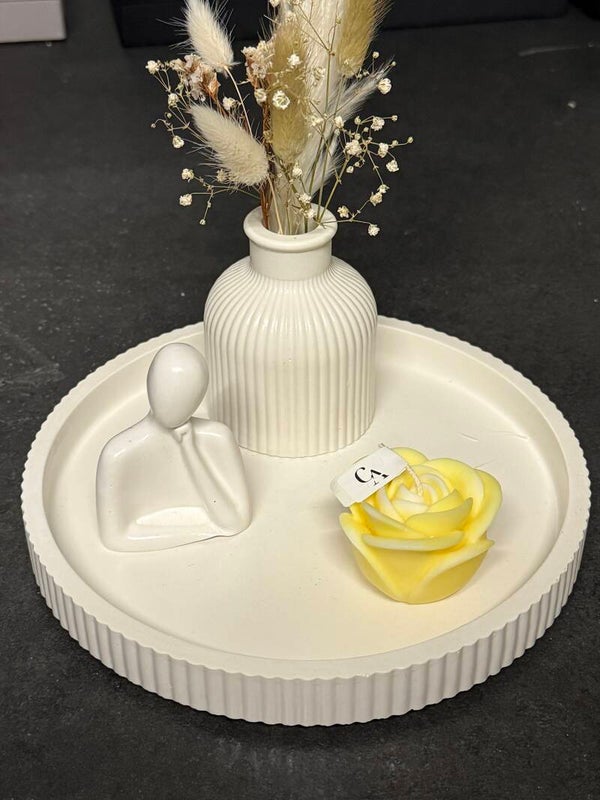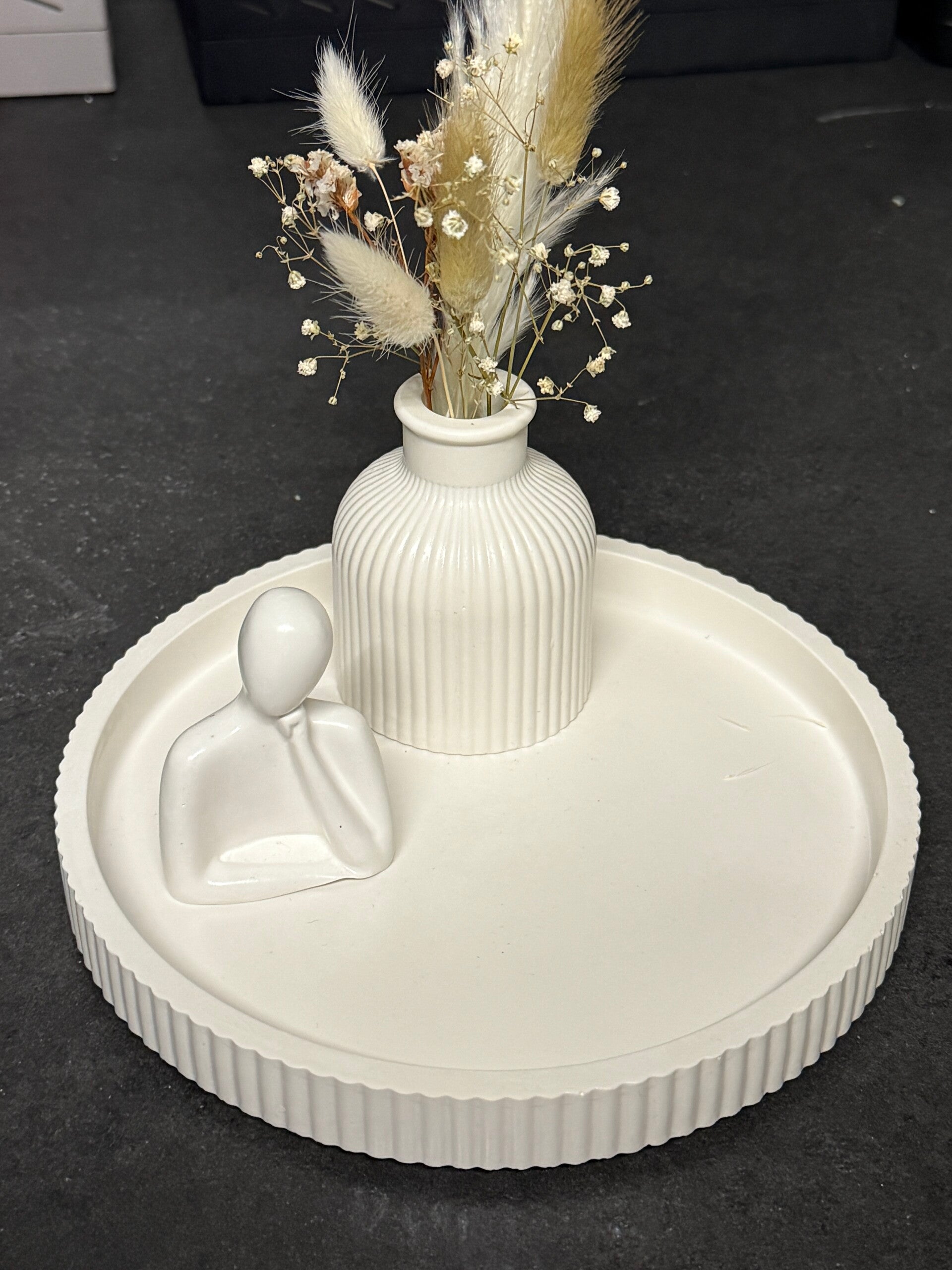 Set: 1 vaasje met droogbloemen + 1 vaasje overig + 1 rond dienblad met opstaande rand; of: 1 vaasje met droogbloemen + 1 beeldje + 1 rond dienblad met opstaande rand.
