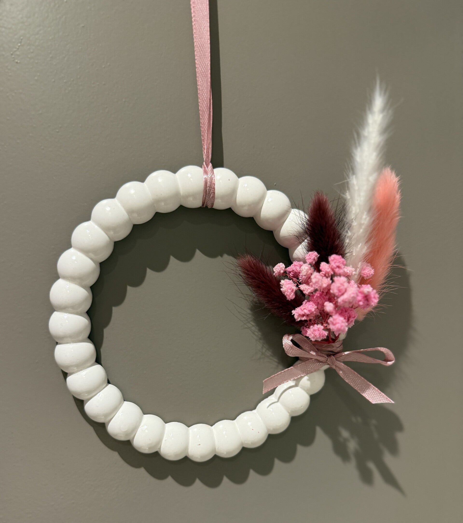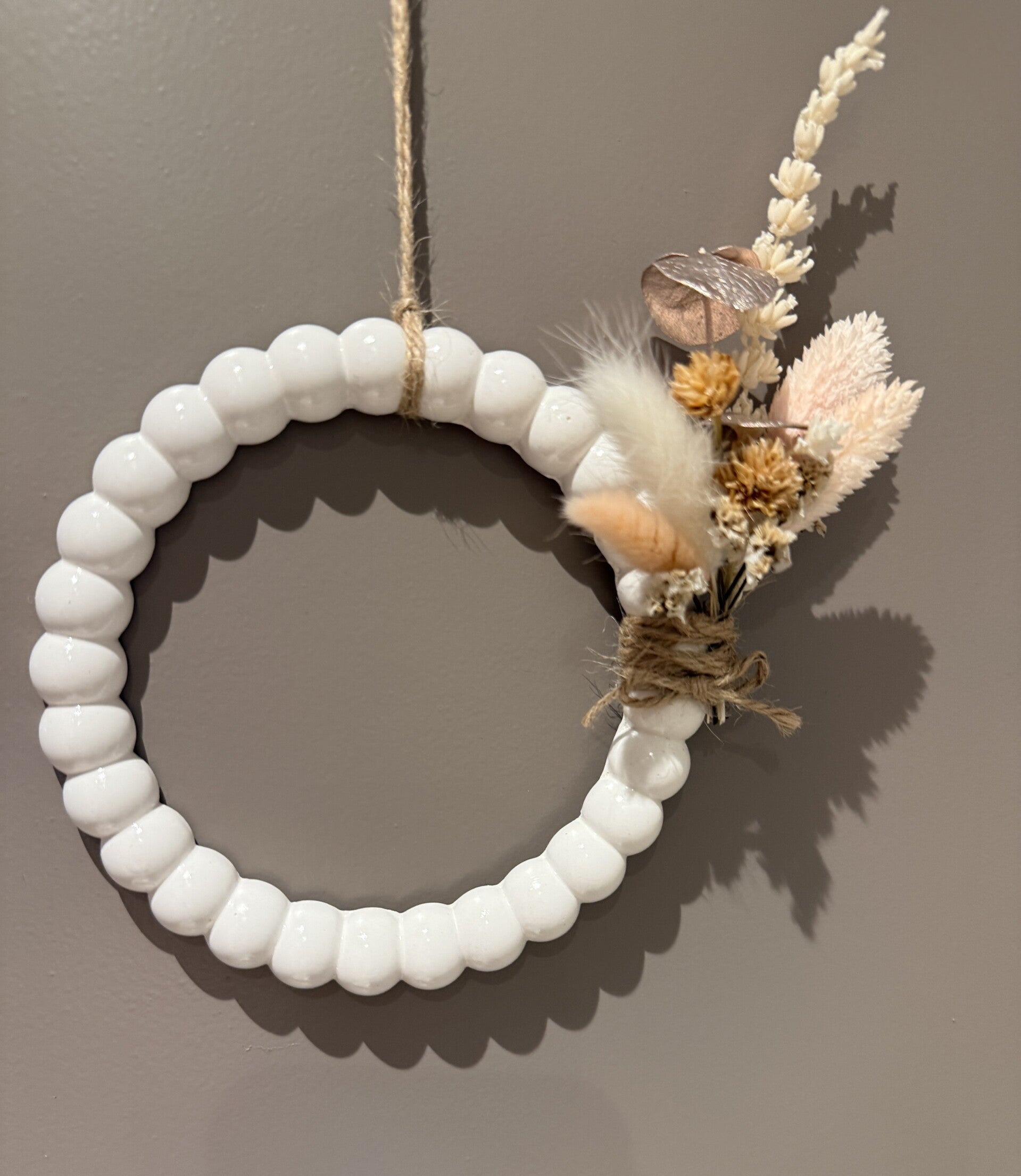 Deze stijlvolle decoratiehanger brengt een zachte, natuurlijke sfeer in huis. De hanger bestaat uit een bubble ring gemaakt van Raysin, afgewerkt met een bosje zorgvuldig geselecteerde droogbloemen. De combinatie van natuurlijke materialen, jute touw en subtiele bloemen zorgt voor een tijdloze, rustgevende uitstraling.