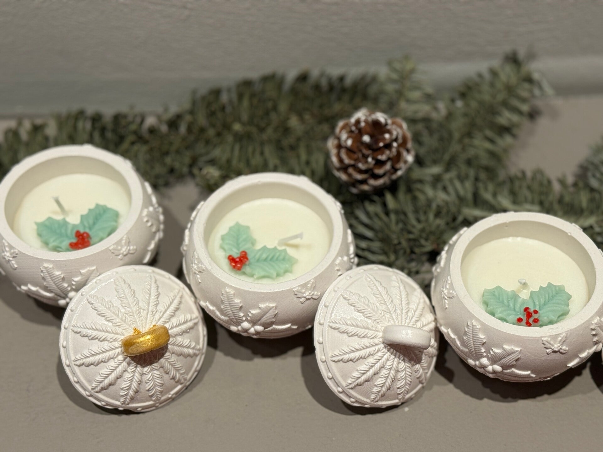 Breng warmte en sfeer in huis met deze prachtige handgemaakte geurkaars in een stijlvolle kerstbal van Raysin. Elk potje is met zorg gegoten, herbruikbaar en afgewerkt met fijne details van hulstblaadjes en bessen – perfect voor de feestdagen!