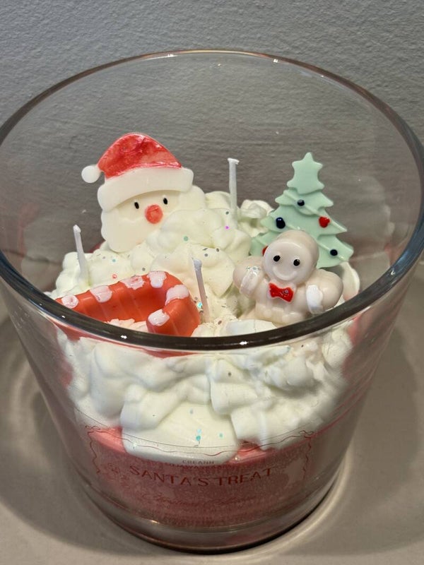 De “Santa’s Treat” geurkaars lijkt wel een heerlijk kersttaartje! De kaars is met de hand gegoten in een elegante glazen pot en rijkelijk versierd met een kerstman, een kerstboom en een schattig gingerbread mannetje bovenop een romige ‘slagroom’-laag van was. Het geheel is afgewerkt met een subtiele laag glitters, die fonkelen in het kaarslicht en zorgen voor een extra feestelijke uitstraling.