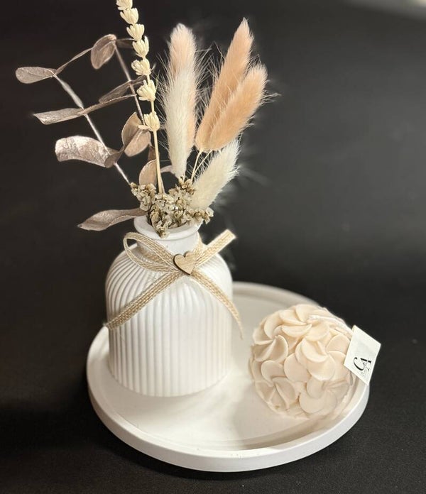 - Set: 1 vaasje met droogbloemen + 1 rond dienblad