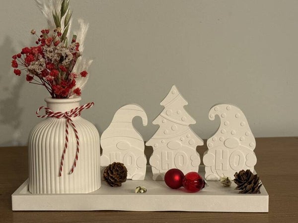 De set bestaat uit een wit ribbelvaasje met rood-witte strik, gevuld met droogbloemen in warme wintertinten. Daarbij horen drie witte kerstfiguren met de tekst “Ho Ho Ho” (twee kerstgnomes en een kerstboompje), geplaatst op een bijpassende tray — allemaal met zorg gegoten uit Raysin.