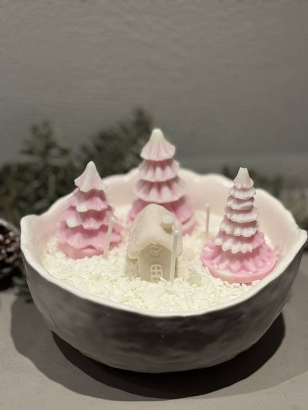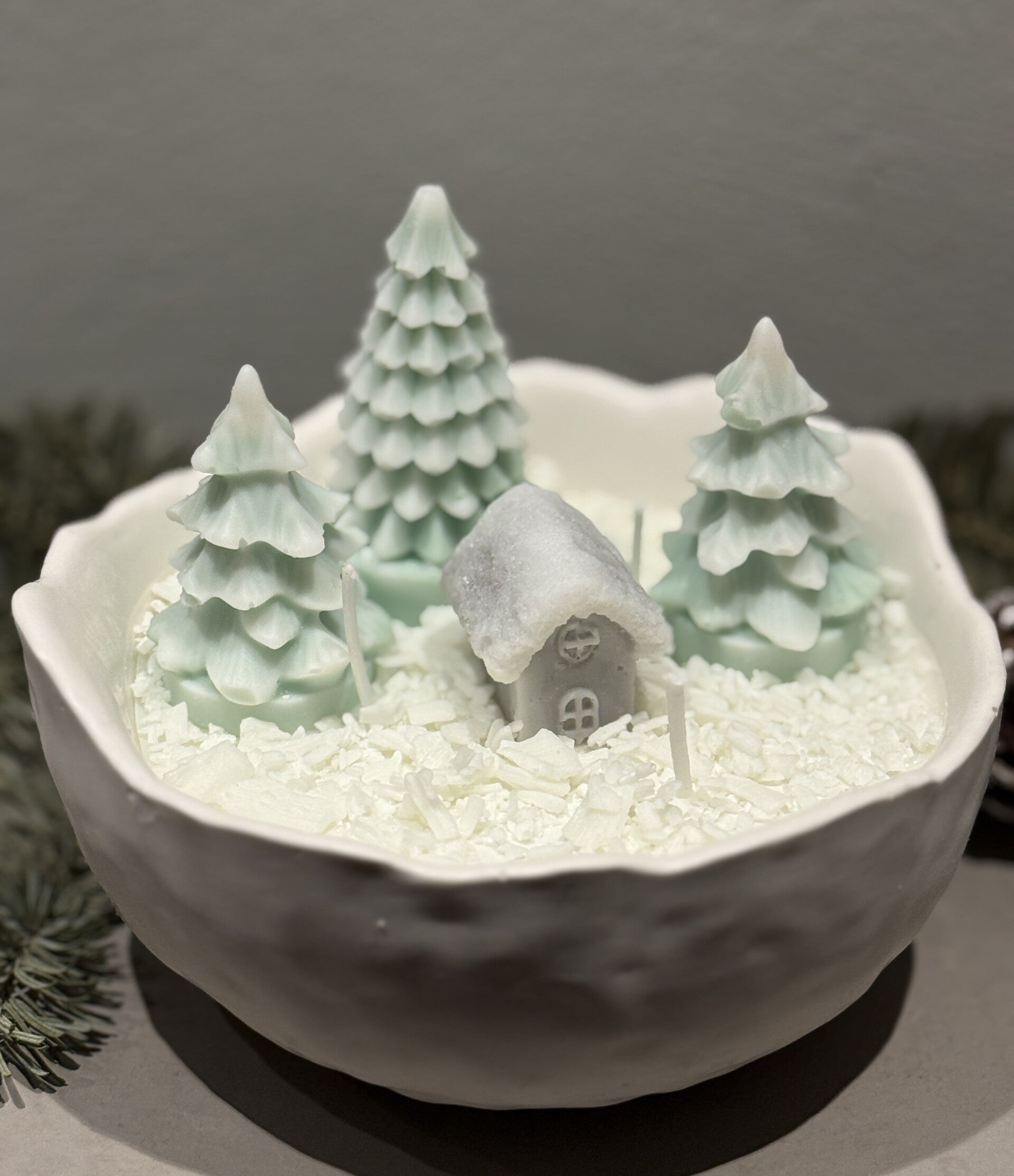 Breng de magie van een winters sprookje in huis met onze Snowy Pines geurkaars. Deze bijzondere kaars is gegoten in een handgemaakte en herbruikbare schaal van Raysin, met oog voor detail en ambacht. In de schaal vind je sierlijke dennenbomen, een schattig huisje en een laagje “sneeuw” van fijne soja-wasvlokken – samen vormen ze een betoverend miniatuur winterlandschap.