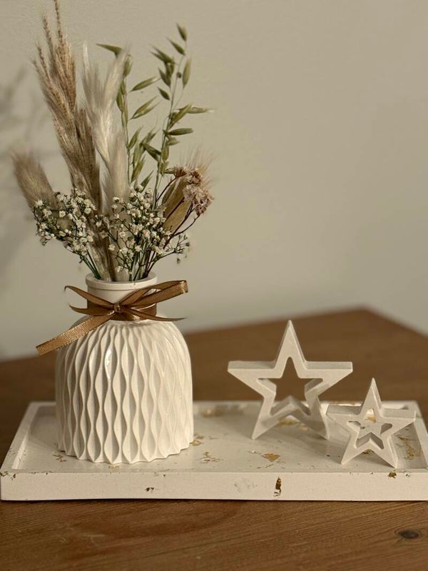 Set: 1 wit vaasje met reliëfpatroon gevuld met droogbloemen en champagnekleurige strik + 1 rechthoekig schaaltje met goud-accent.