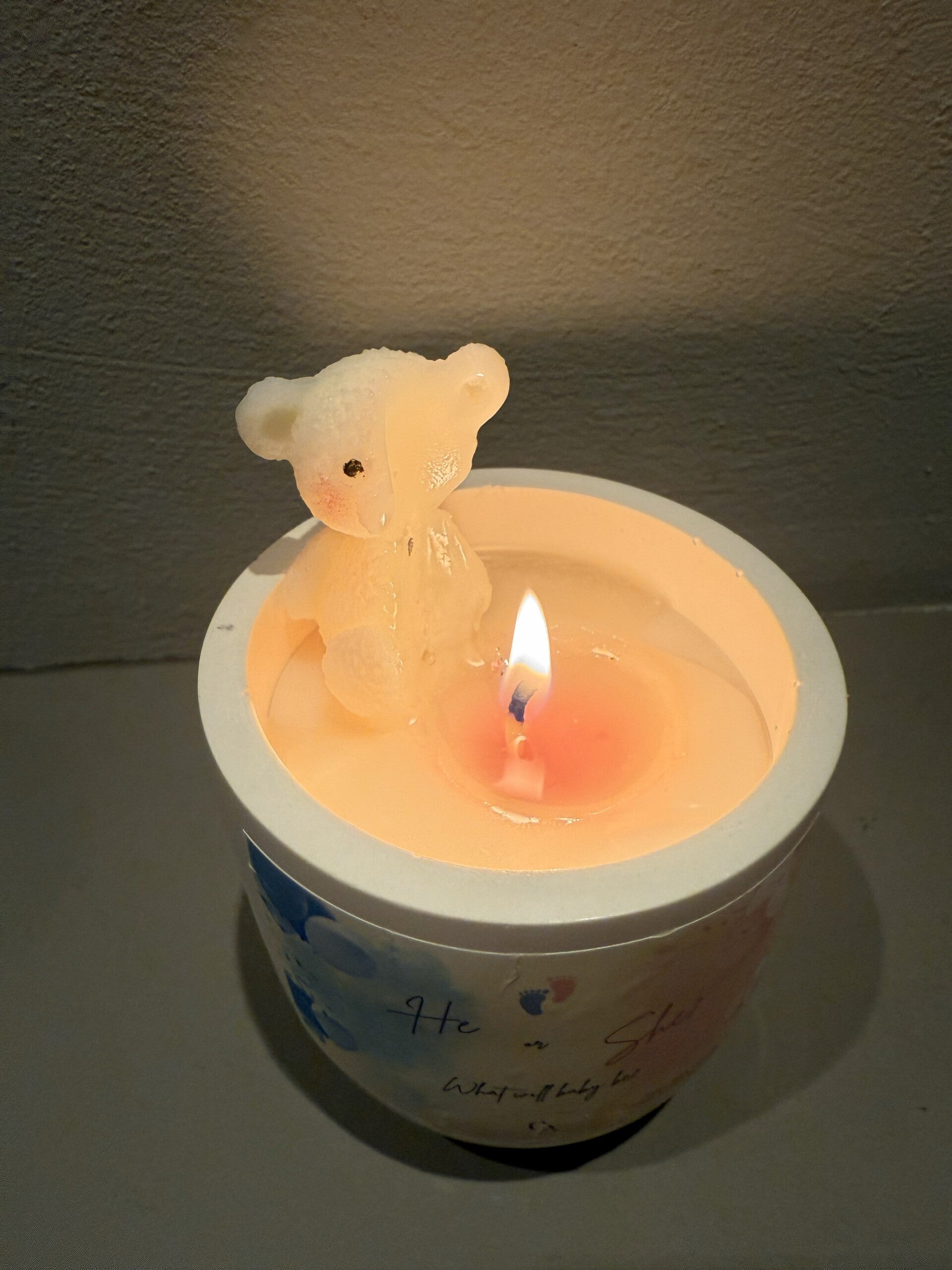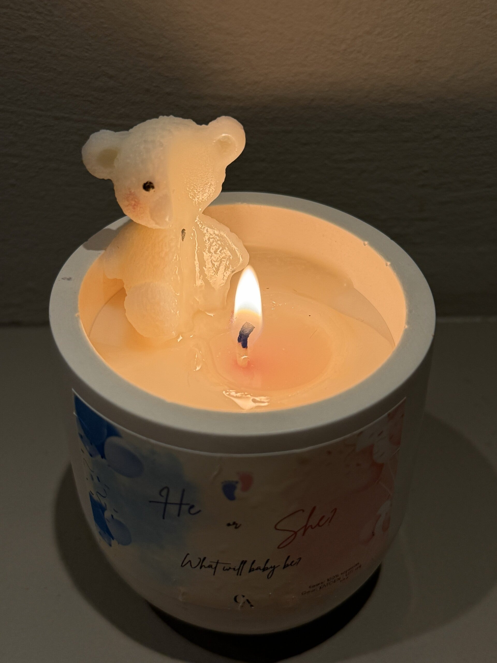 De kaars is afgewerkt met een schattig teddybeertje van kaarsenwas, wat haar perfect maakt als eyecatcher tijdens een gender reveal party, babyshower of als uniek cadeau voor aanstaande ouders.