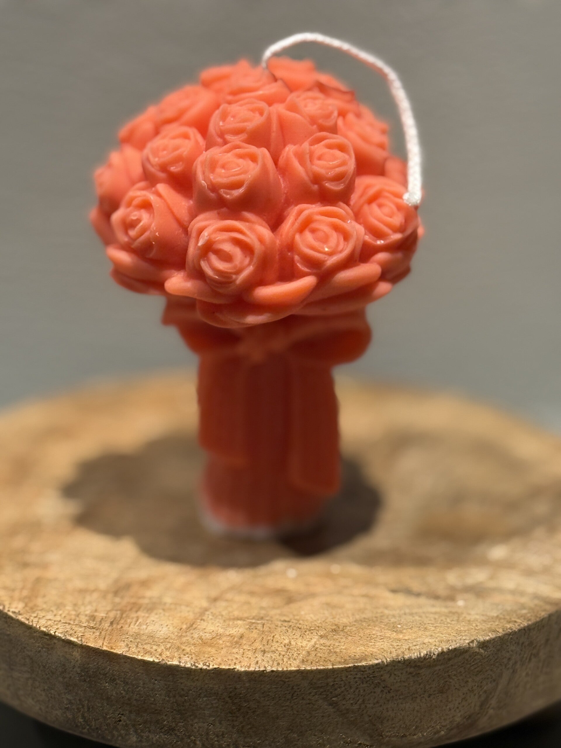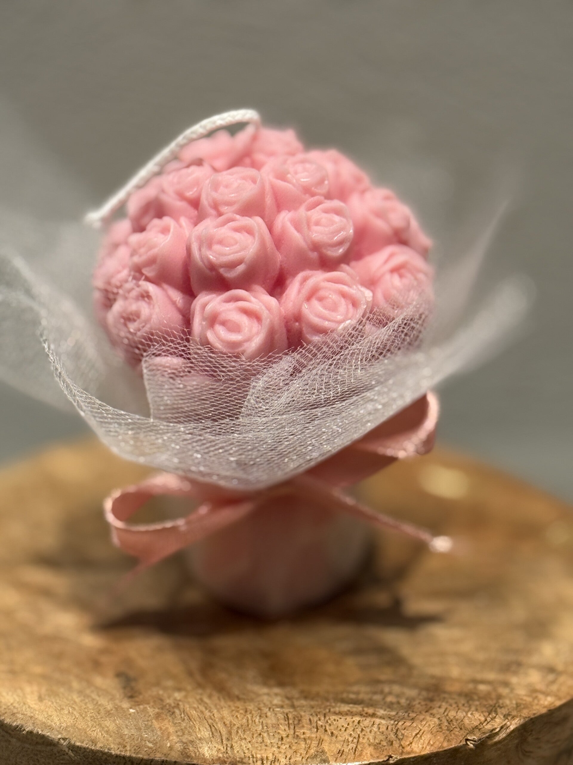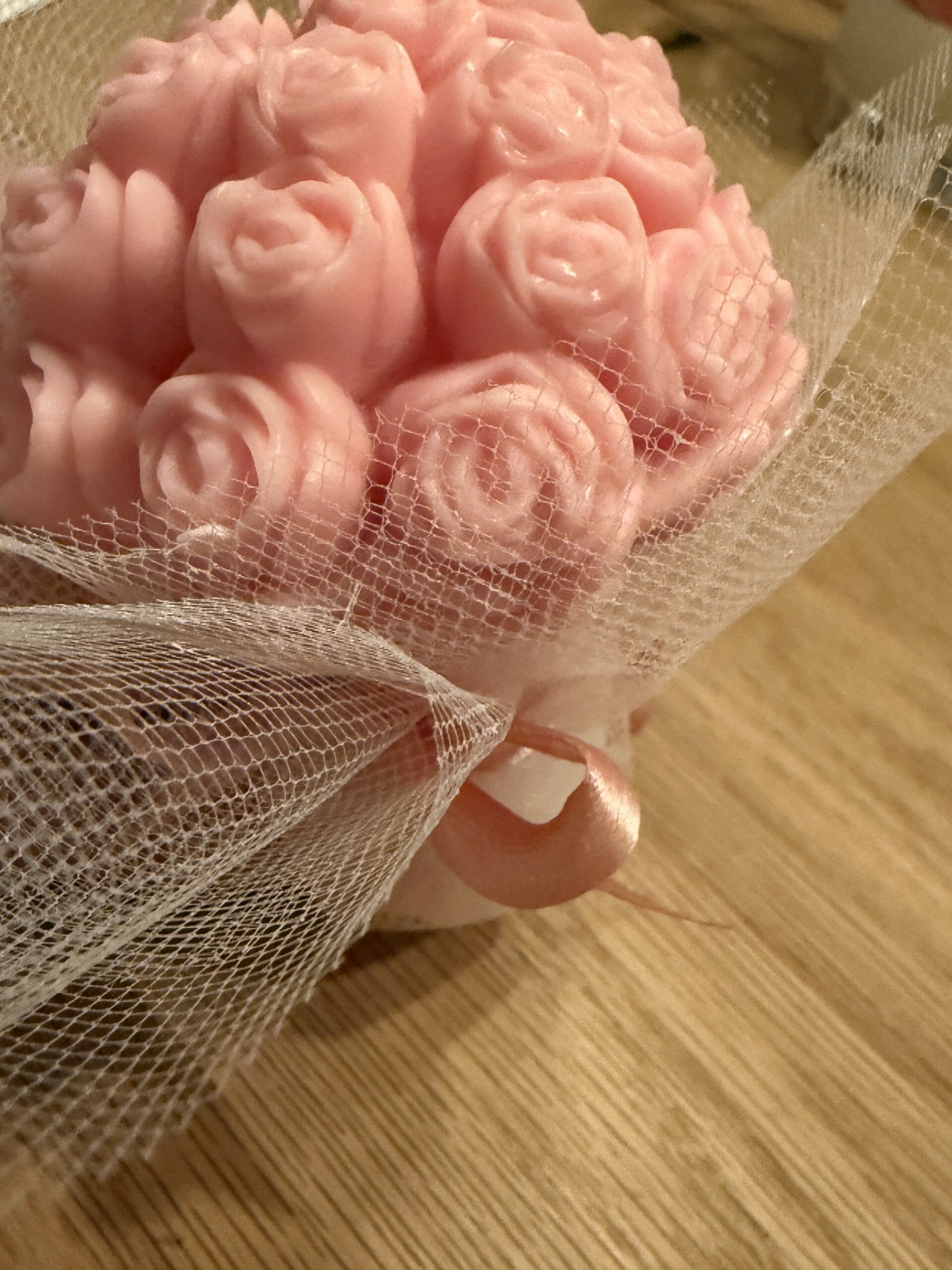 Rozenboeketje van sojawas ingepakt in tule met een strikje.