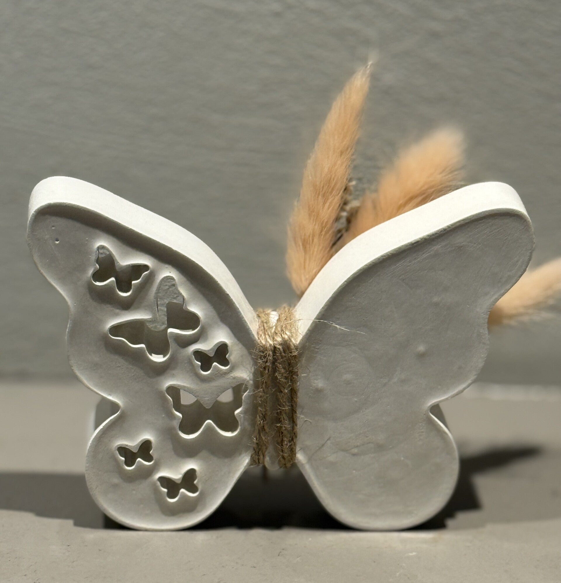 Decoratieve vlinder gemaakt van Raysin, afgewerkt met droogbloemen.
