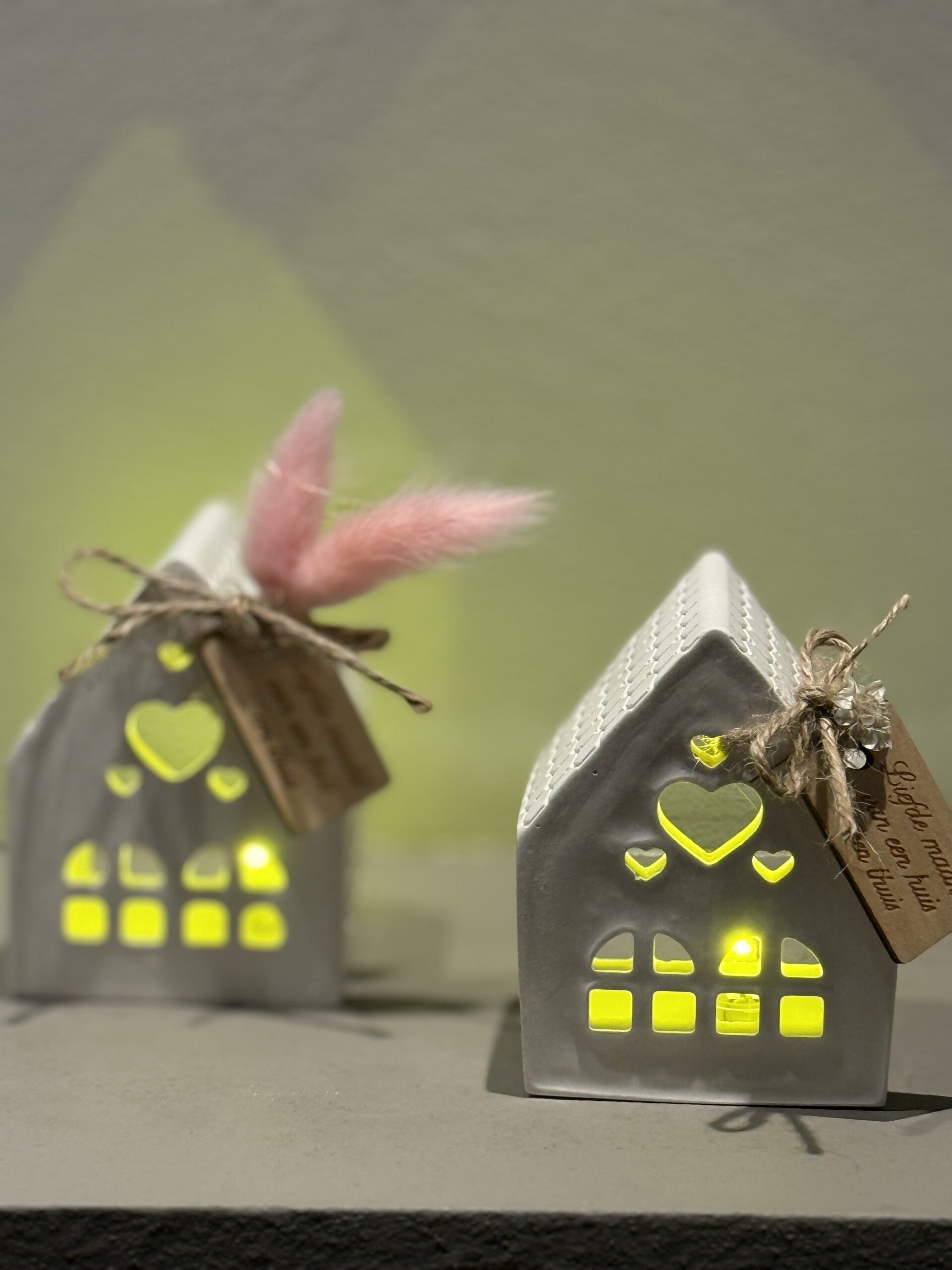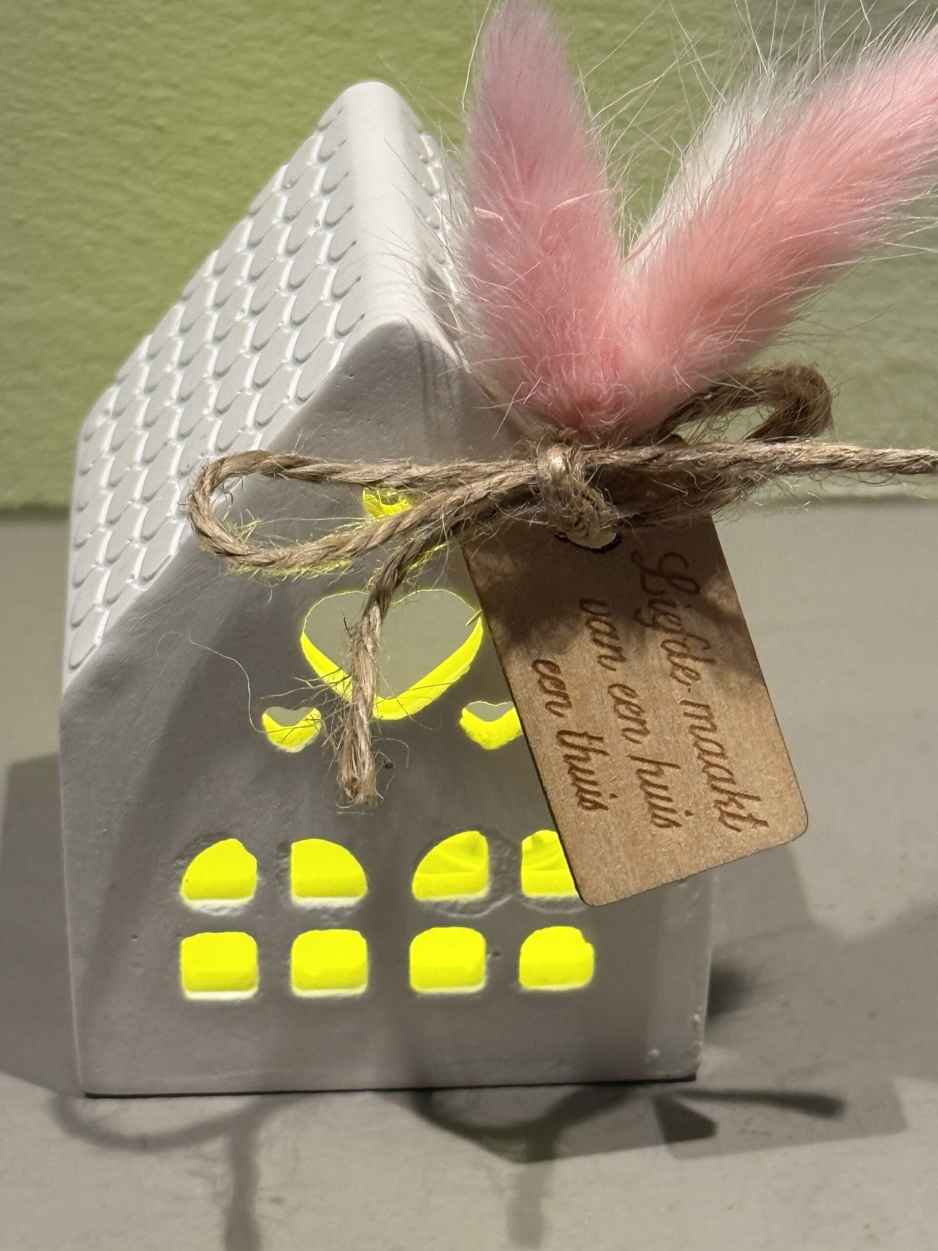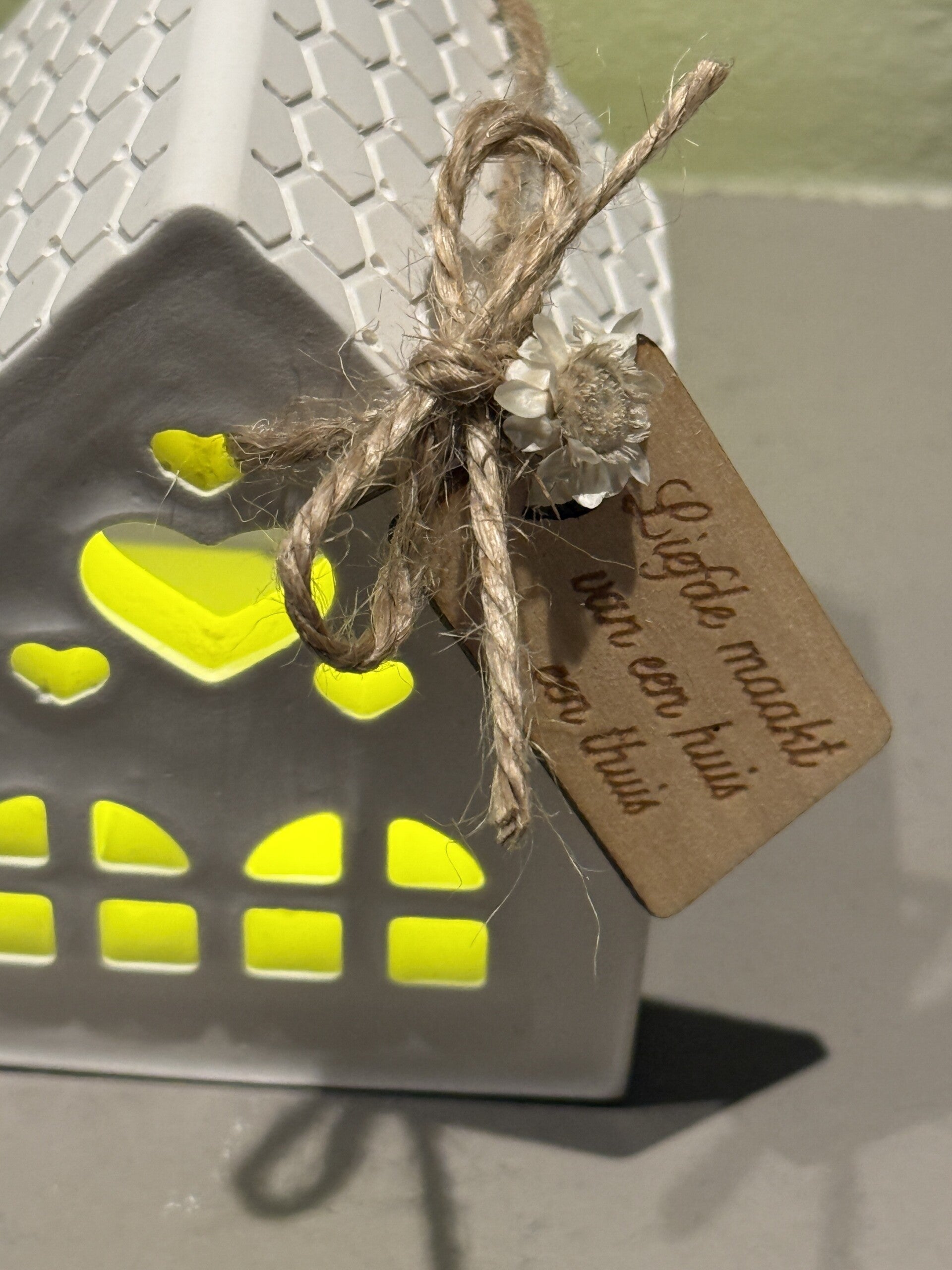 Huisje gemaakt van Raysin afgewerkt met een houten label met de quote 'Liefde maakt van een huis een thuis' en kleine droogbloempjes.