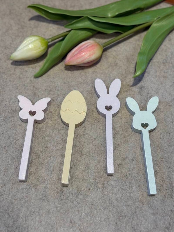 Setje bestaande uit een staafje van +/- 6,5 cm met hierop een paasfiguur afgebeeld. Totale hoogte van plantensteker +/- 9 à 10 cm