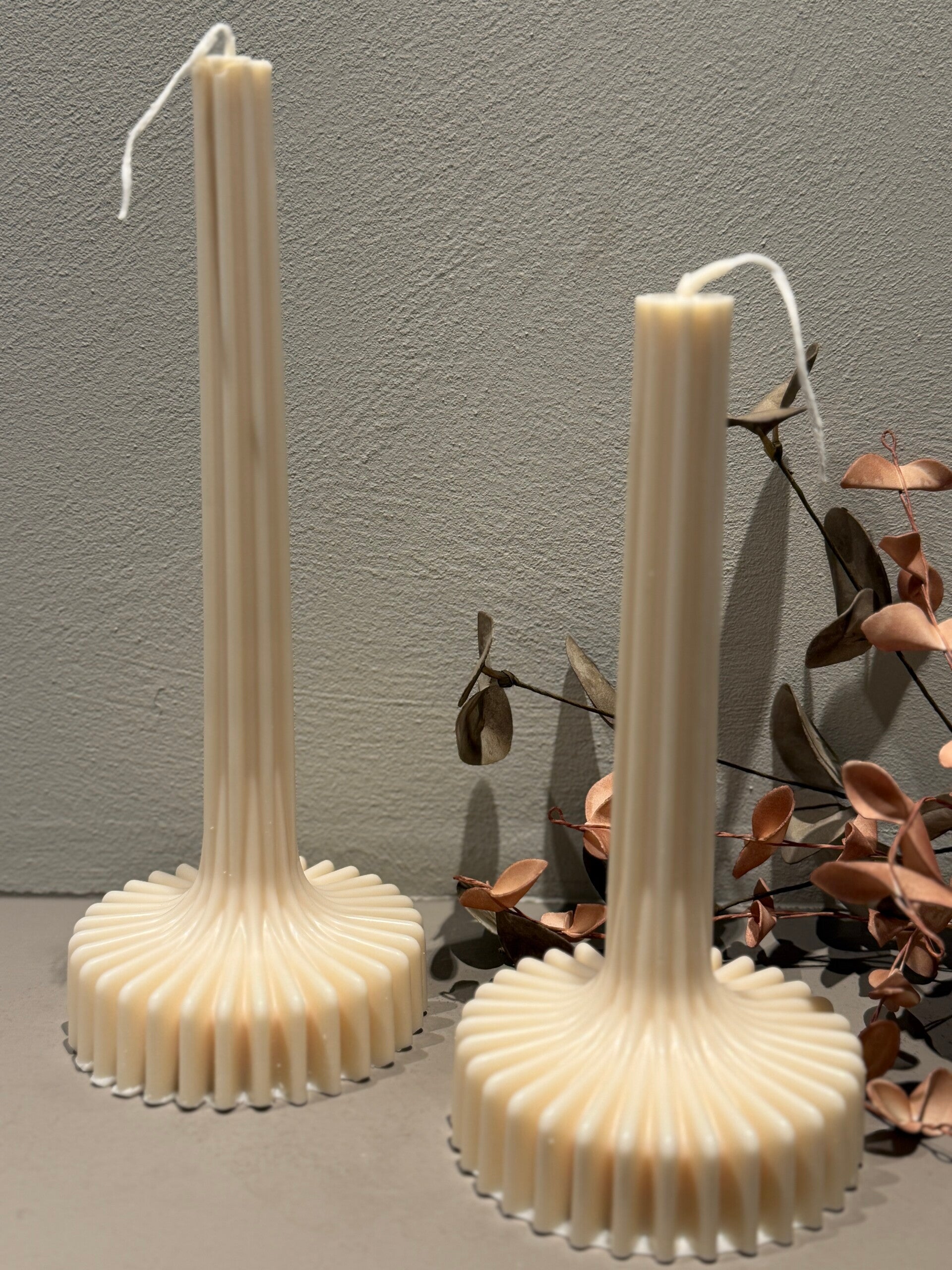 Breng sfeer en design samen met deze elegante sculpturale kaars. De verfijnde ribbelstructuur en vloeiende vormen geven de kaars een moderne, minimalistische uitstraling die perfect past in elk interieur. Dankzij het unieke silhouet is deze kaars niet alleen een lichtbron, maar ook een stijlvol decoratiestuk.