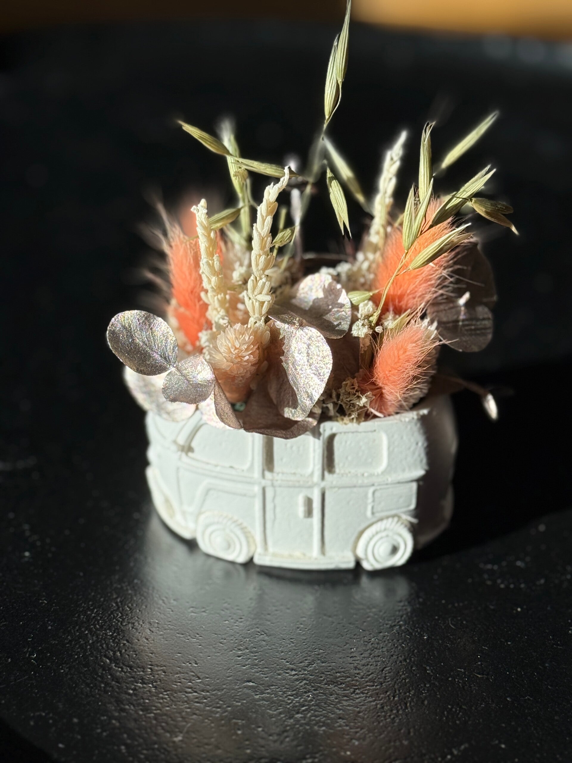 Busje gemaakt van Raysin, opgevuld met droogbloemen.