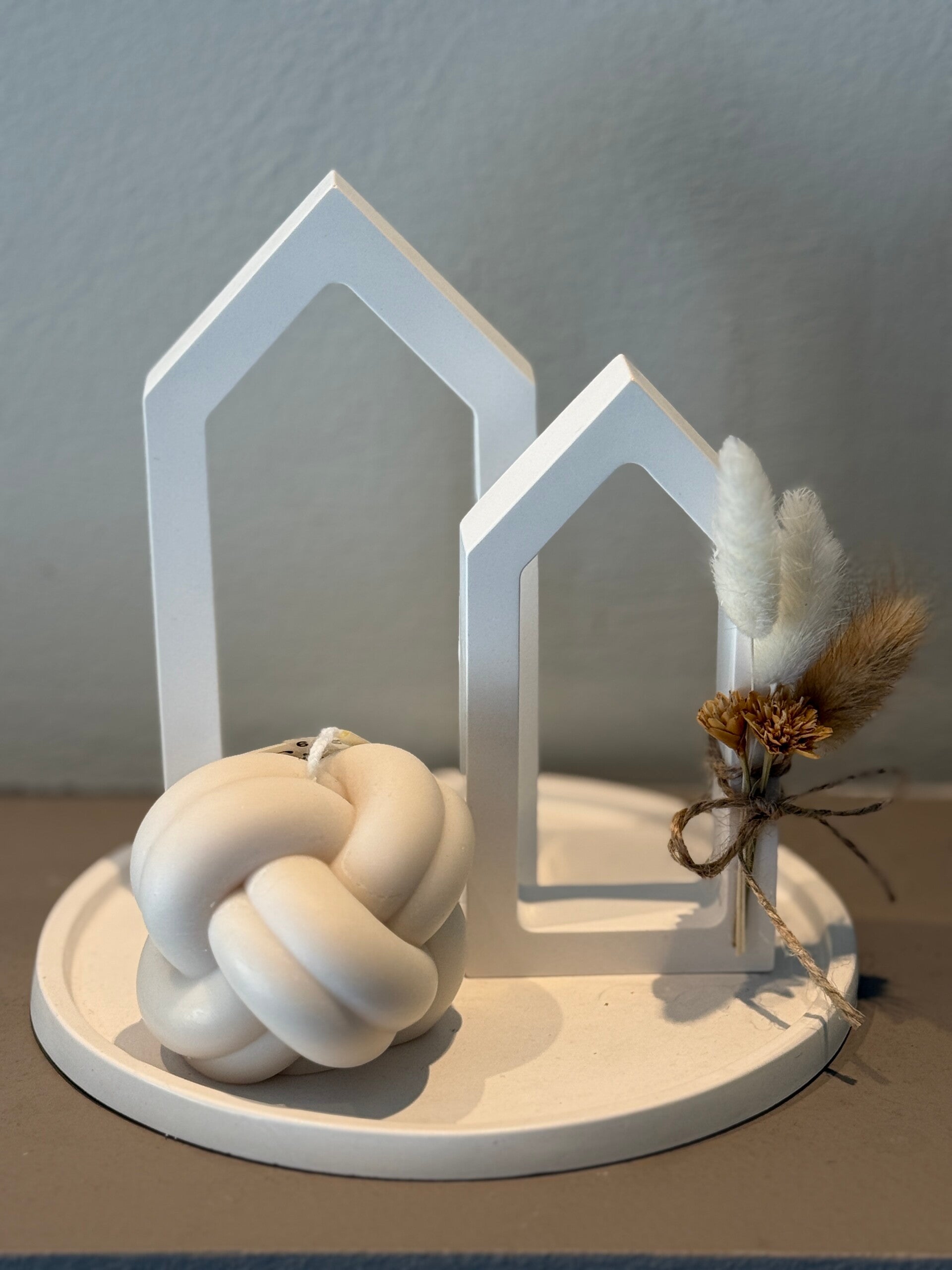 Elk stuk wordt met aandacht afgewerkt en subtiel gedecoreerd met echte droogbloemen, waardoor een unieke combinatie ontstaat van minimalistisch design en warme, organische details.